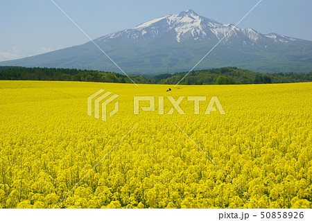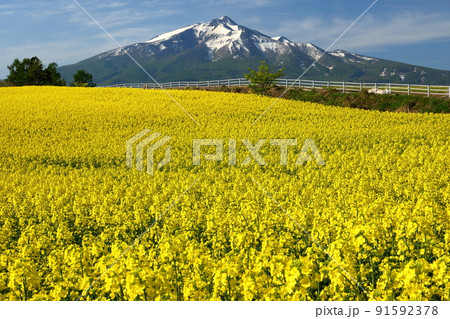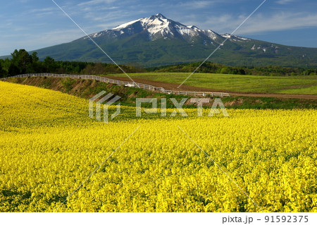 青森県西津軽郡鰺ヶ沢町建石町 一面の菜の花畑と冠雪した岩木山