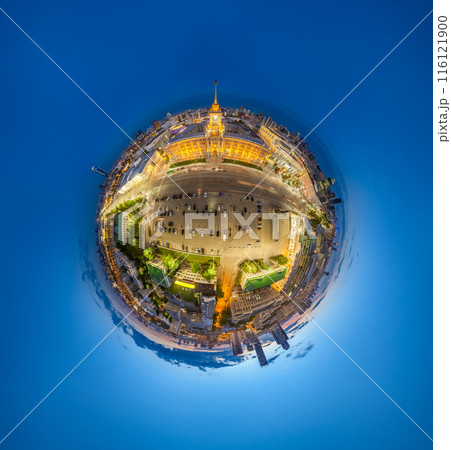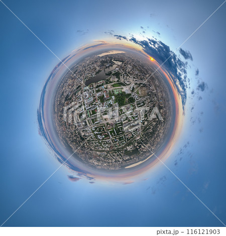 Yekaterinburg City Administration or City Hall and Central square at summer evening. Evening city in the summer sunset, Aerial View. Little planet sphere mode.