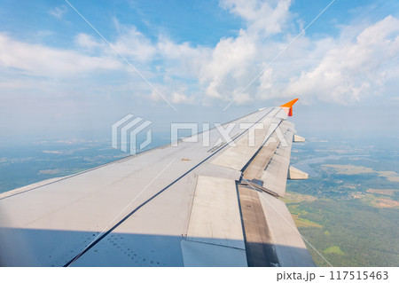 View of airplane wing, blue skies and green land during landing. Airplane window view.