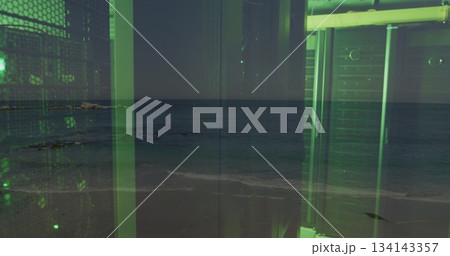 Green-tinted industrial frame rising on sandy shoreline amid mesh panels, beams, pipes, copy space