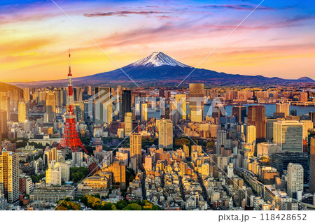 Aerial view of Tokyo cityscape with Fuji mountain in Japan.