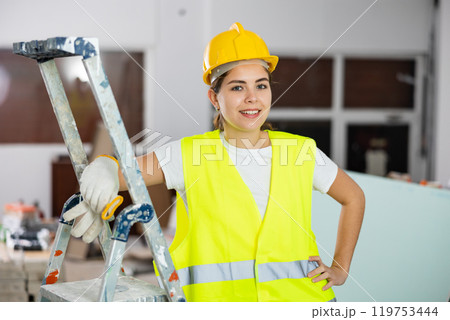 Female contractor working inside home for renovation and refurbishment project with copy space