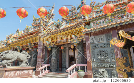 Architecture view of the Buddhist temple with Sculptured dragons pillars and Red lantern in front of Wat Dhammakatanyu.