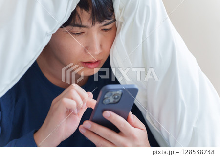 布団の中でスマホを使う男性