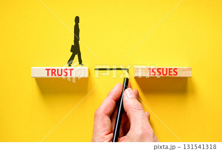 Trust issues symbol. Concept word Trust issues on beautiful wooden blocks. Beautiful yellow paper background. Businesswoman icon. Business trust issues concept. Copy space.