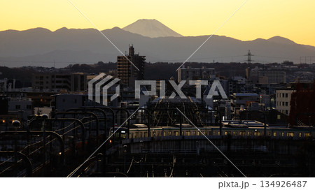 関東の冨士見100景に選ばれている「成城の不動橋」から見た富士山、小田急喜多見電車基地に向かう電車