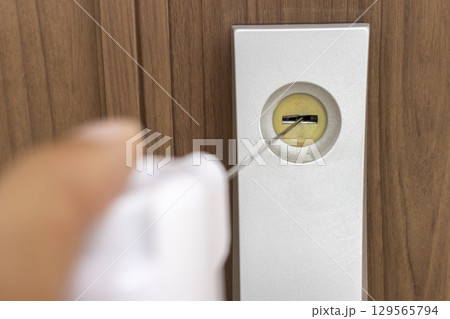 玄関ドアの鍵穴にスプレーで潤滑剤を入れるイメージ