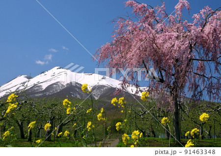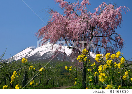 青森県弘前市弥生平 岩木山環状線オオヤマザクラネックレスロード沿いのベニシダレザクラと菜の花と岩木山