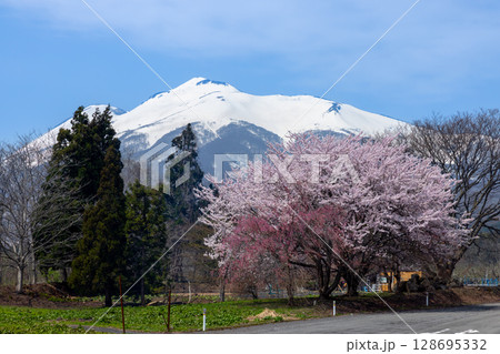 青森県弘前市弥生平 残雪の岩木山と山麓の満開の桜