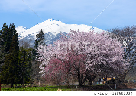 青森県弘前市弥生平 岩木山環状線オオヤマザクラネックレスロード沿いのベニシダレザクラと冠雪の岩木山