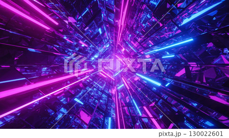 Futuristic neon tunnel with abstract geometric patterns in pink and blue light