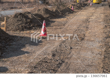 アスファルト敷設工事現場の丁張りの水貫