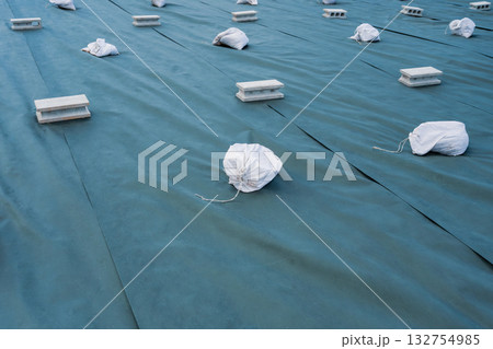 土のう袋で固定した防草シート