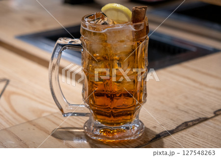 A glass of whiskey with lemon and cinnamon, on the table