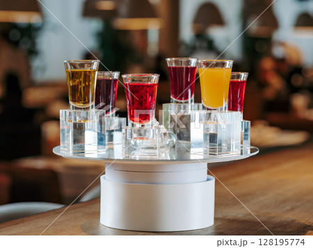 Set of colorful different bitters and liqueurs in shot glasses on restaurant table. Collection of shooters. Selection of natural berry alcoholic tinctures in glasses. Different bitters and liqueurs