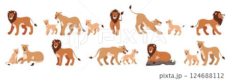 Lion animal family. Lioness, cub baby, king cat. Jungle cartoon flat zoo characters. Safari nature wild. Mammal in wildlife, pride in savannah. Vector illustration African tidy fauna isolated set