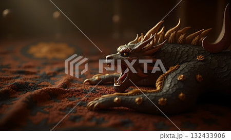 Mythical chinese dragon resting on an ornate carpet bathed in soft warm light creating a