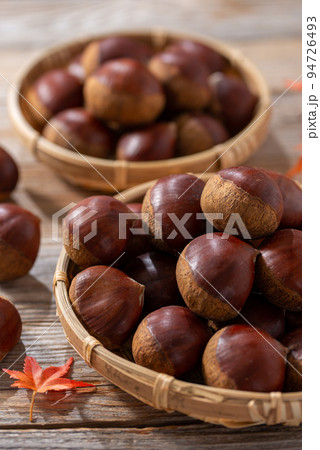 秋の味覚 栗 くり クリ 生栗 茶色の背景