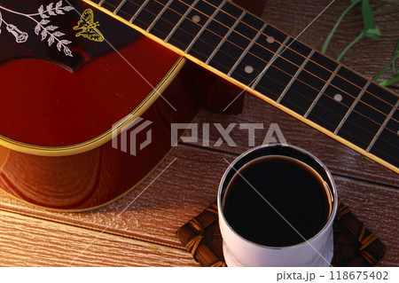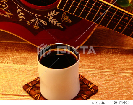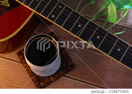 白いカップに入ったアイスコーヒーとギター 休日の過ごし方