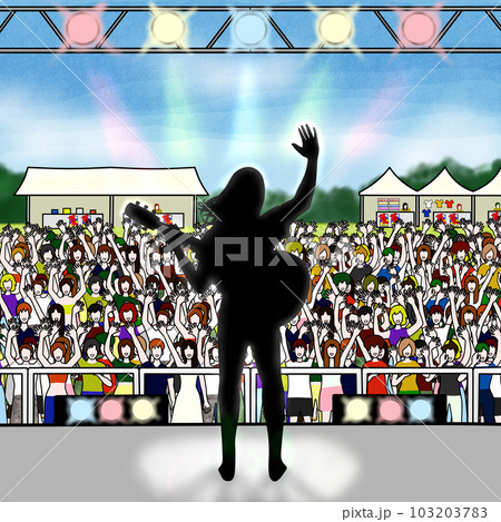 夏フェスで生ギターで弾語りの女性アーティストのイラスト