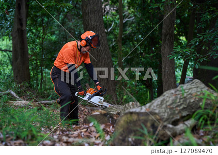 professional lumberjack cuts trunks