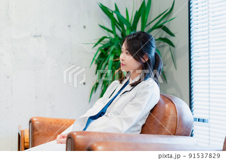 白衣で休憩をする女性の医師