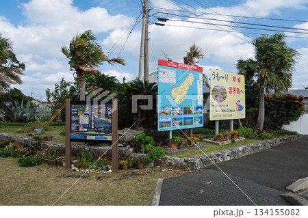 2020年1月8日 喜界島 - 事故当日の強風でたなびくヤシの木と観光案内看板
