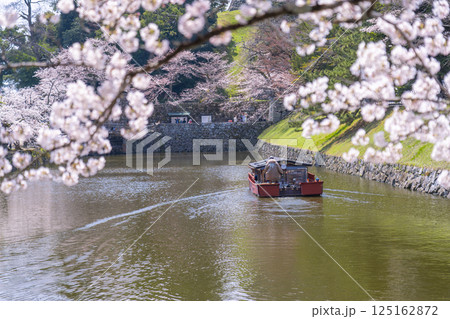 彦根城内堀 満開の桜と屋形船
