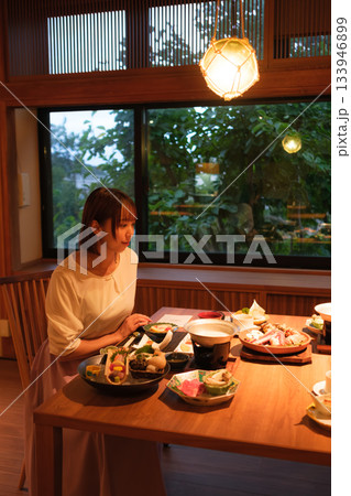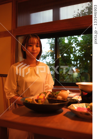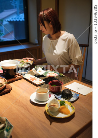 旅館の夕食時間|くつろぐ女性と会席料理
