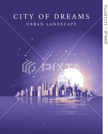 city skyscrapers in water reflection. A long moonlit night. Purple poster. Horizontal panorama. falling starsillustration