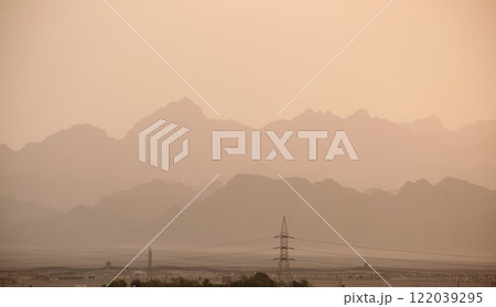 Sunset landscape with dark mountain peaks in egyptian desert and high voltage power lines