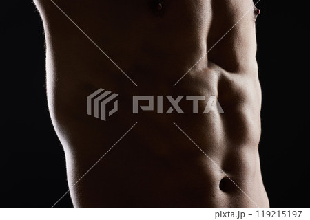 Man, abdomen and muscle in dark studio, shadow and wellness with health, strong and workout by black background. Bodybuilder guy, shirtless and stomach with skin, aesthetic and power in dark for art