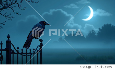 Raven on Iron Gate Under Crescent Moon in Misty Gothic Night.