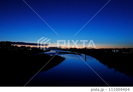 多摩川原橋から見た夜明け前の多摩川と遠くに見える京王線