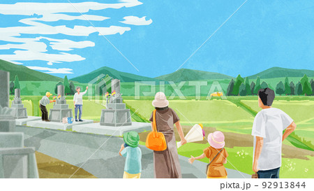 お盆にお墓参りする人たち手書き水彩風イラスト
