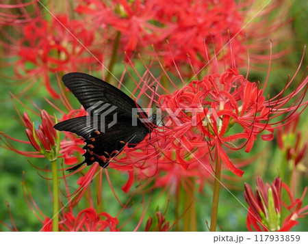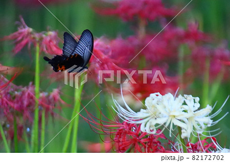 クロアゲハ蝶と赤と白の曼殊沙華のお彼岸の風景