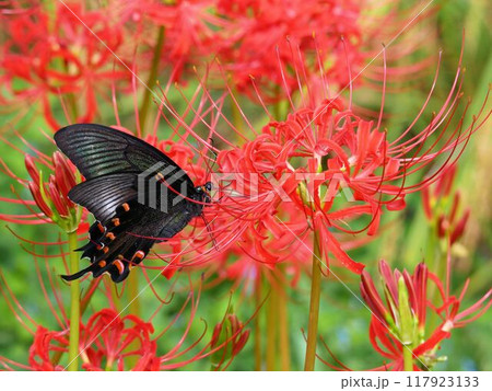 赤いヒガンバナとクロアゲハ(apilio protenor)