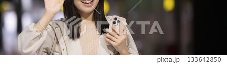 スマホを片手に夜の街に立つ若手ビジネスウーマン