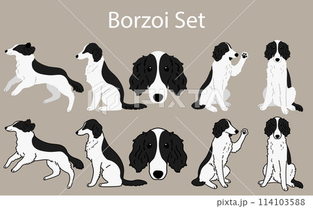 シンプルで可愛い白と黒のボルゾイのイラストセット
