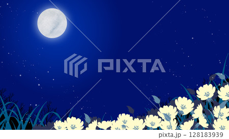 満月の夜、月見草の花畑に蝶が飛ぶイラスト