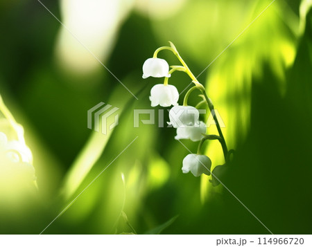 木漏れ日を受けて咲くスズランの花