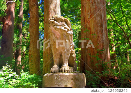中国地方・大山隠岐国立公園・大神山神社奥宮、後向き門の奥で本殿を守る巨大な狛犬・鳥取県大山町(5)