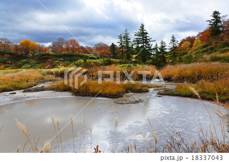 秘湯八幡平後生掛温泉草紅葉と灰色の沼