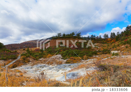 十和田八幡平国立公園の後生掛温泉の紅葉と噴煙