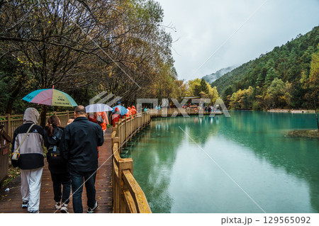 Lakeside Path and Tourists with Umbrellas in Blue Moon Valley, Lijiang, China