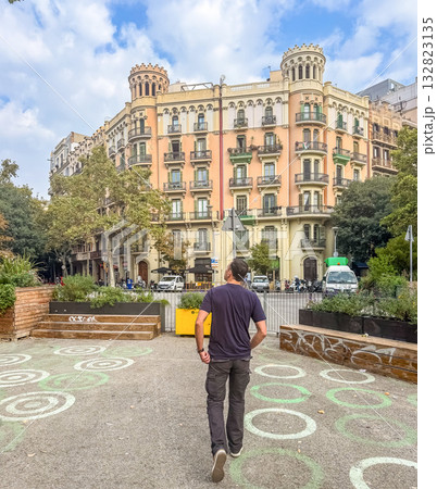 Man Walking Toward Historic Residential Building in City Square