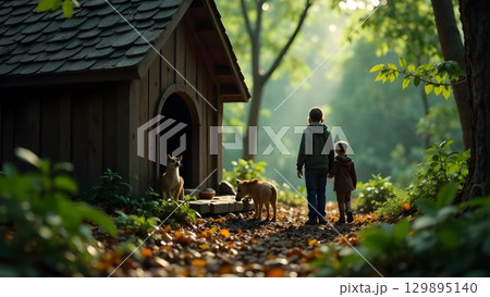 Banner. Elderly man and his retriever explore park, where fallen yellow and orange leaves create, vibrant backdrop.