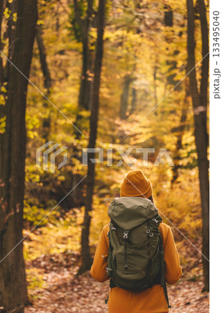woman traveler with backpack and looking at amazing forest, wanderlust travel concept, space for text, atmospheric epic moment