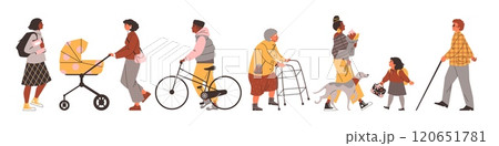 Walking citizens. Fashion people outdoor street walk, city crowd person in casual outfit guy on skateboard woman with bag adult man talk smartphone splendid vector illustration