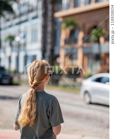 A young female traveler walking with a suitcase outdoors, rear view. Check-in at the hotel.The concept of urban transport and travel.